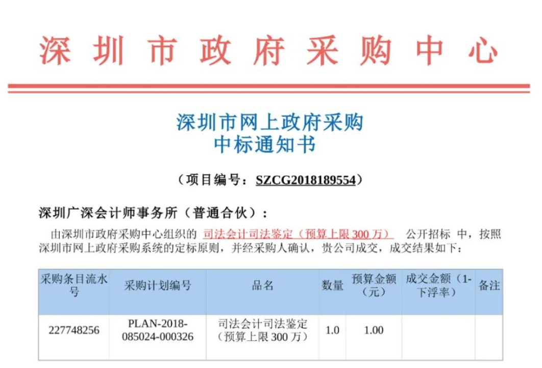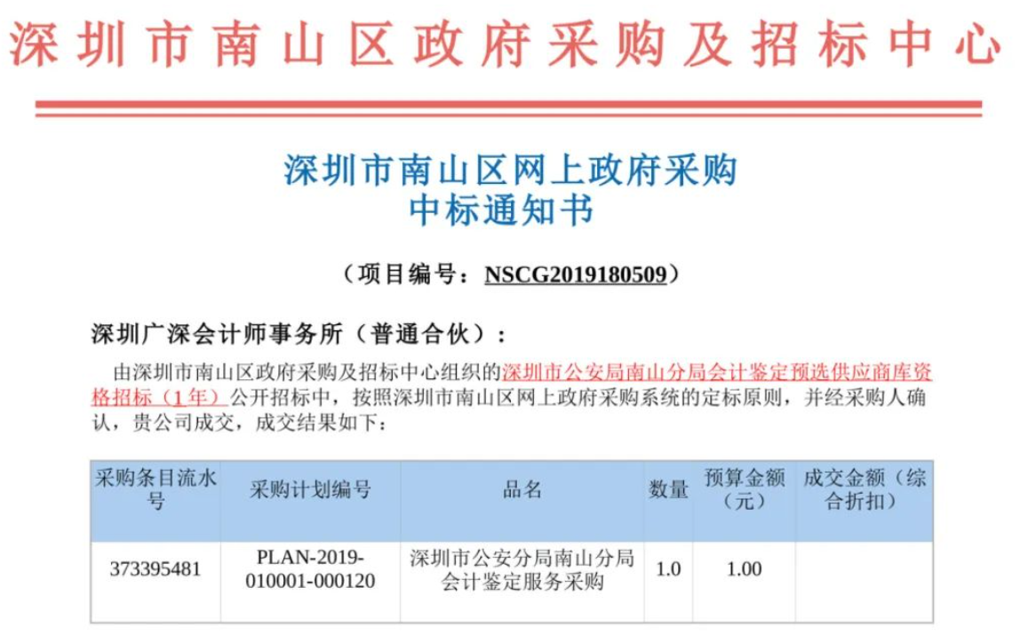 本次是深圳市公安局南山分局第二次对会计类司法鉴定的长期服务供应商组织招标。2019年12月第一次招标活动中,经深圳市南山区政府采购及招标中心组织公开招标活动,总计有28家会计师事务所报名参加投标活动,包括广深所在内的7家单位中标“会计鉴定”长期服务类项目。