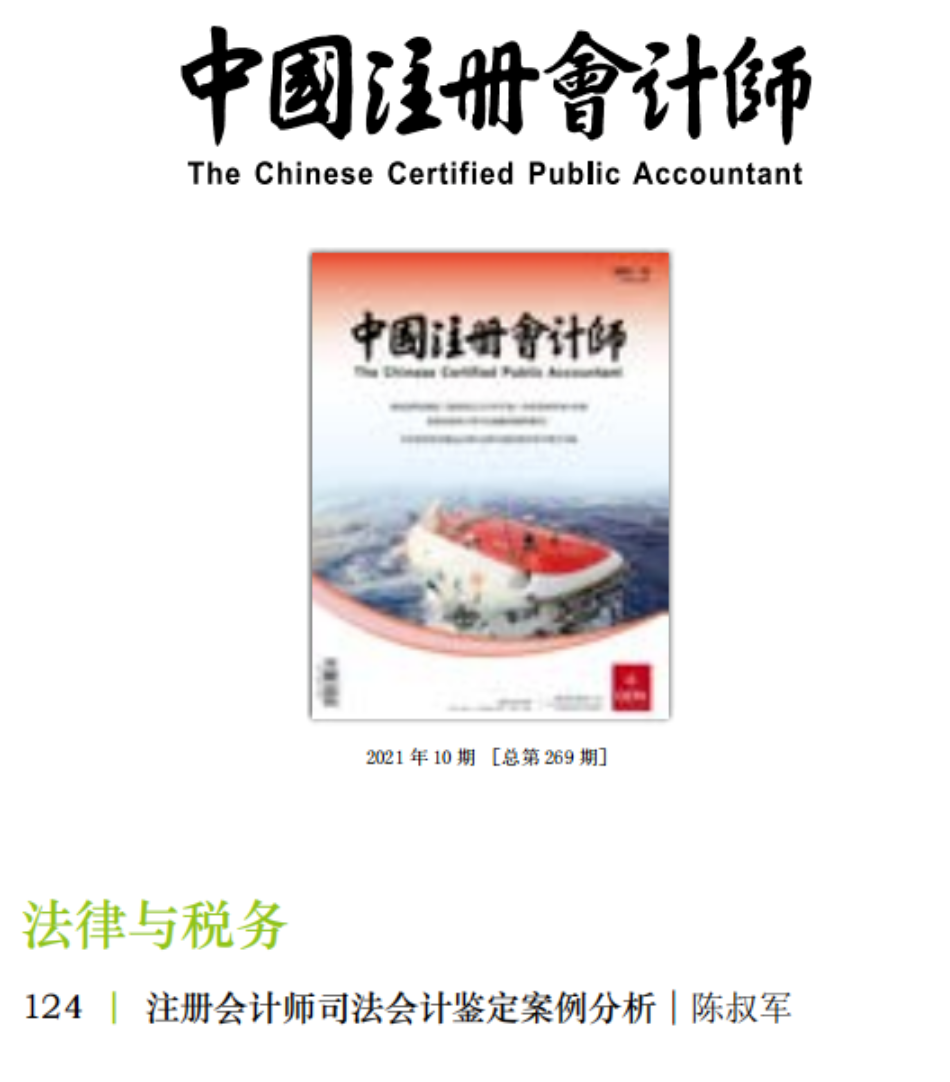 2021年10月陈叔军在中文核心期刊《中国注册会计师》发表司法会计论文《注册会计师司法会计鉴定案例分析》。中国注册会计师杂志由财政部主管,代表了中国注册会计师行业最高学术水平。