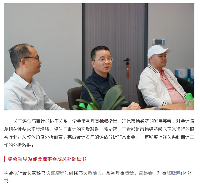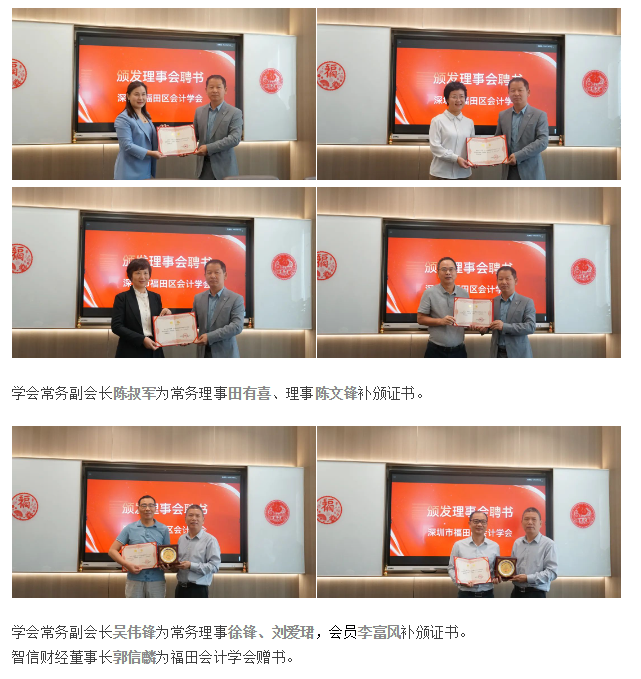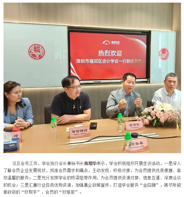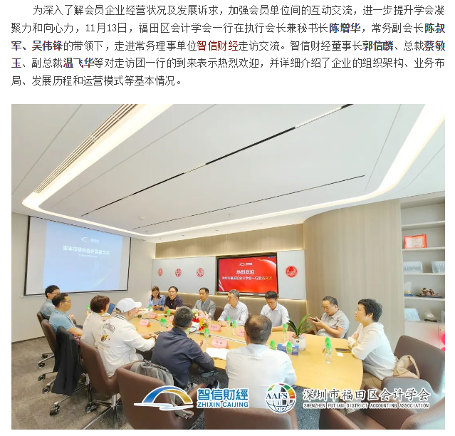 深圳市福田区会计行业11.13会员走访出席人员名单陈增华 学会执行会长兼秘书长陈叔军 学会常务副会长、深圳广深会计师事务所所长吴伟锋 学会常务副会长、中汇信达(深圳)税务师事务所董事长刘爱珺 学会常务理事、中税网(深圳)税务师事务所总经理贺 蕾 学会常务理事、国新证券股份有限公司深圳深南大道证券营业部总经理徐 锋 学会常务理事、北京中林资产评估有限公司(深圳分公司)总经理田有喜 学会常务理事、深圳市惠诚会计师事务所所长管盛春 学会常务理事、中天运会计师事务所深圳分所合伙人陈文锋 学会理事、深圳市禾望电气股份有限公司财务总监骆晓鸿 学会理事、深圳市国策房地产土地估价有限公司董事长赵万坡 学会会员、深圳市厚臻会计师事务所郭信麟 智信财经董事长蔡敏玉 学会副秘书长、智信财经总裁温飞华 智信财经副总裁