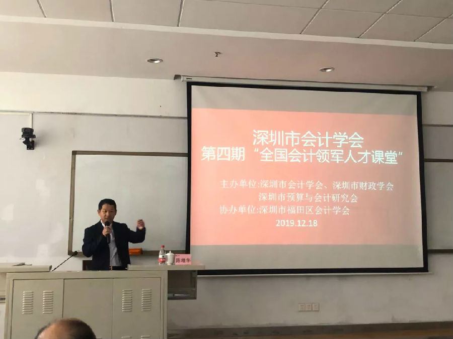 019 年 12 月 18 日下午,由深圳市会计学会、深圳市财政学会、深圳市预算与会计研究会主办,深圳市福田区会计学会承办的第四期 “全国会计领军人才课堂”讲座,在深圳市委党校举行,来自深圳 市行政事业单位及企业的 80 多位会计专业人士参加了此次讲座。